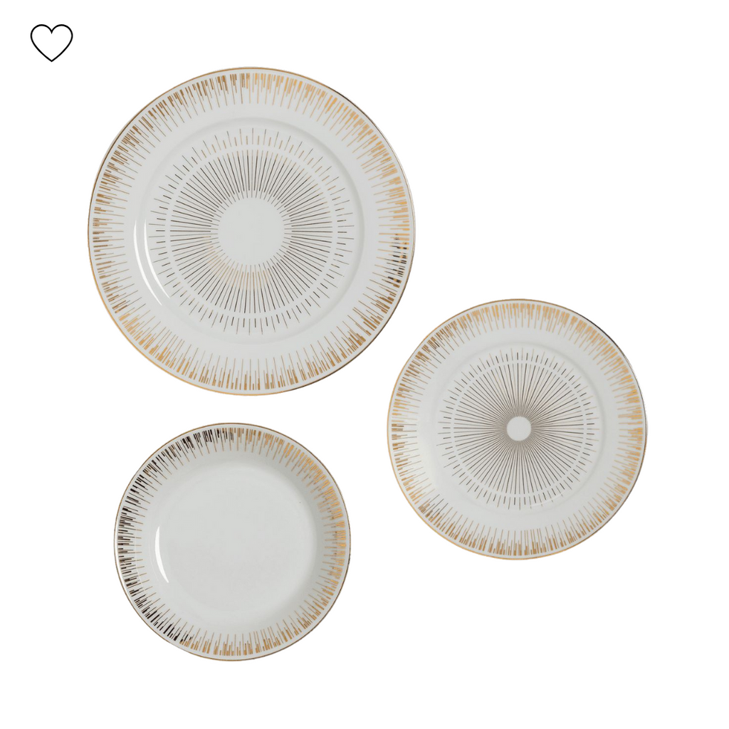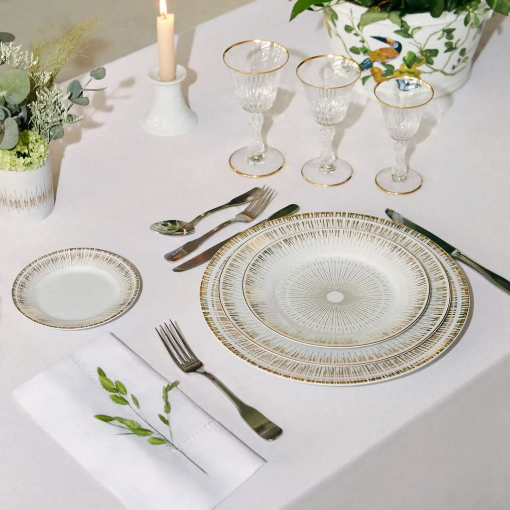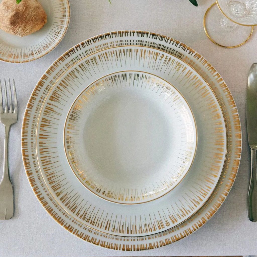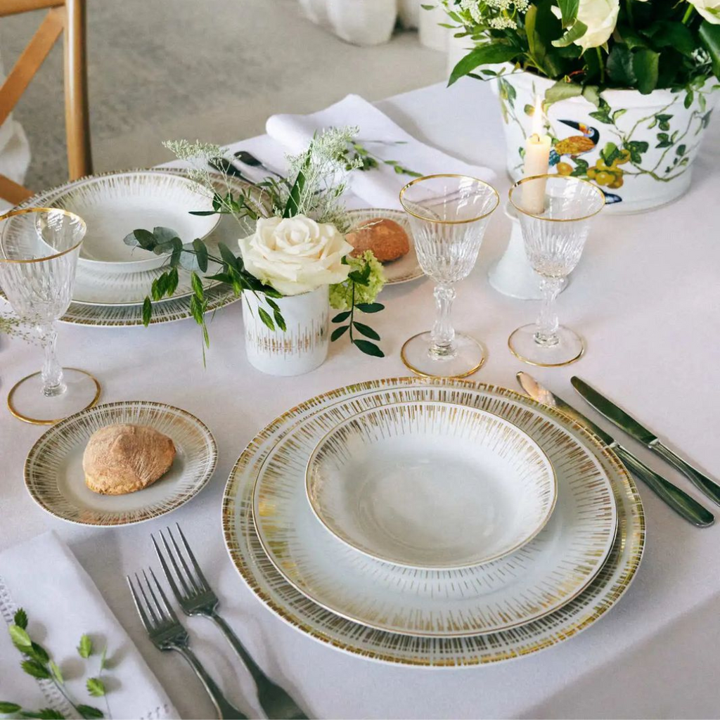 Aparelho de Jantar Sol com bordas douradas trás uma mesa posta elegante e decorativa para qualquer refeição.