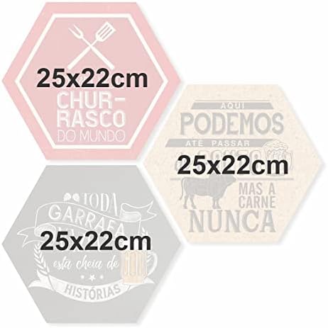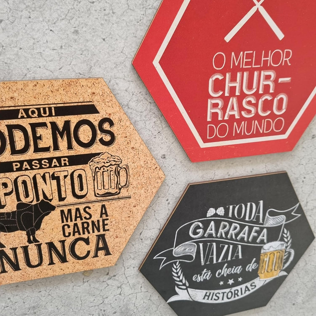 Kit com 3 placas decorativas em mdf. Cada placa possui 25x22cm. Confeccionadas em MDF com 3m, acabamento feito em corte a laser. - O melhor Churrasco do mundo. - Aqui até podemos passar do ponto, mas a carne nunca. - Toda garrafa vazia está cheia de histórias.