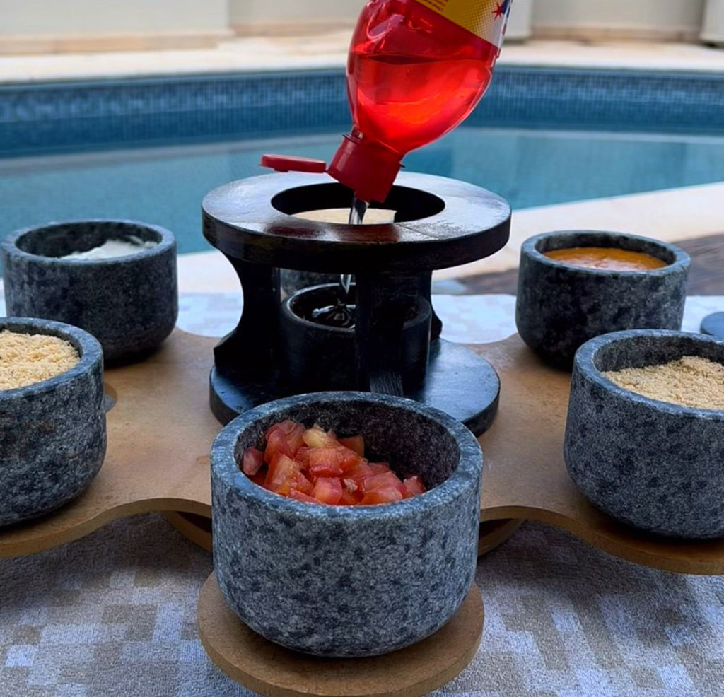 - Material: Pedra sabão e vidro (tampa).